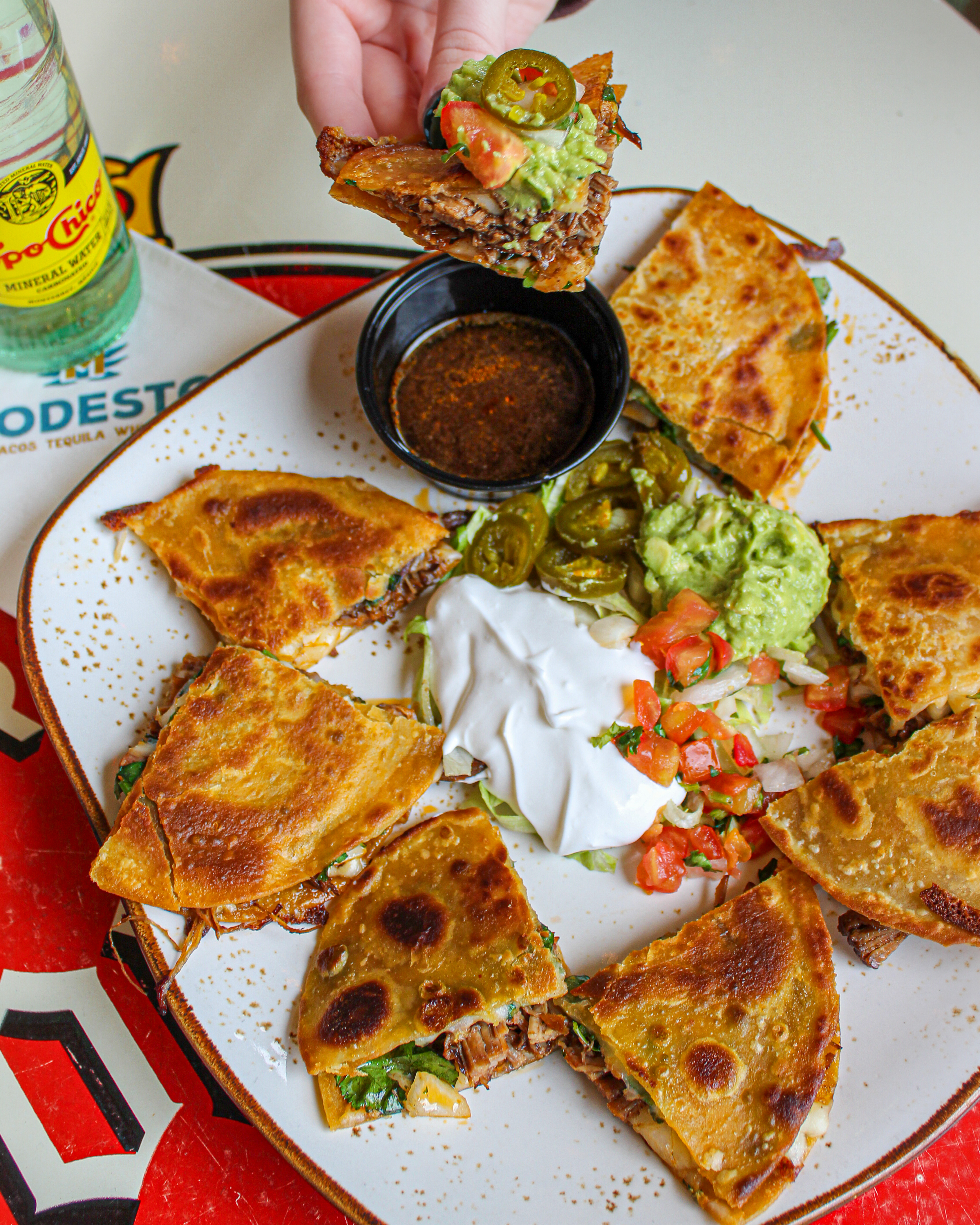 MODESTO Tacos Tequila Whiskey is fresh authentic Mexican creating a unique menu featuring signature tacos, including Al Pastor cooked on a Trompo (vertical rotisserie), Carne Asada, Pollo Adobado, Local Fish Tacos, Oaxacan style Carnitas, and Slow-Roasted Barbacoa, all on Homemade Corn Tortillas. The restaurant will also use from-scratch sauces, salsas and corn and flour tortillas, made off-site and brought to the restaurant fresh daily.